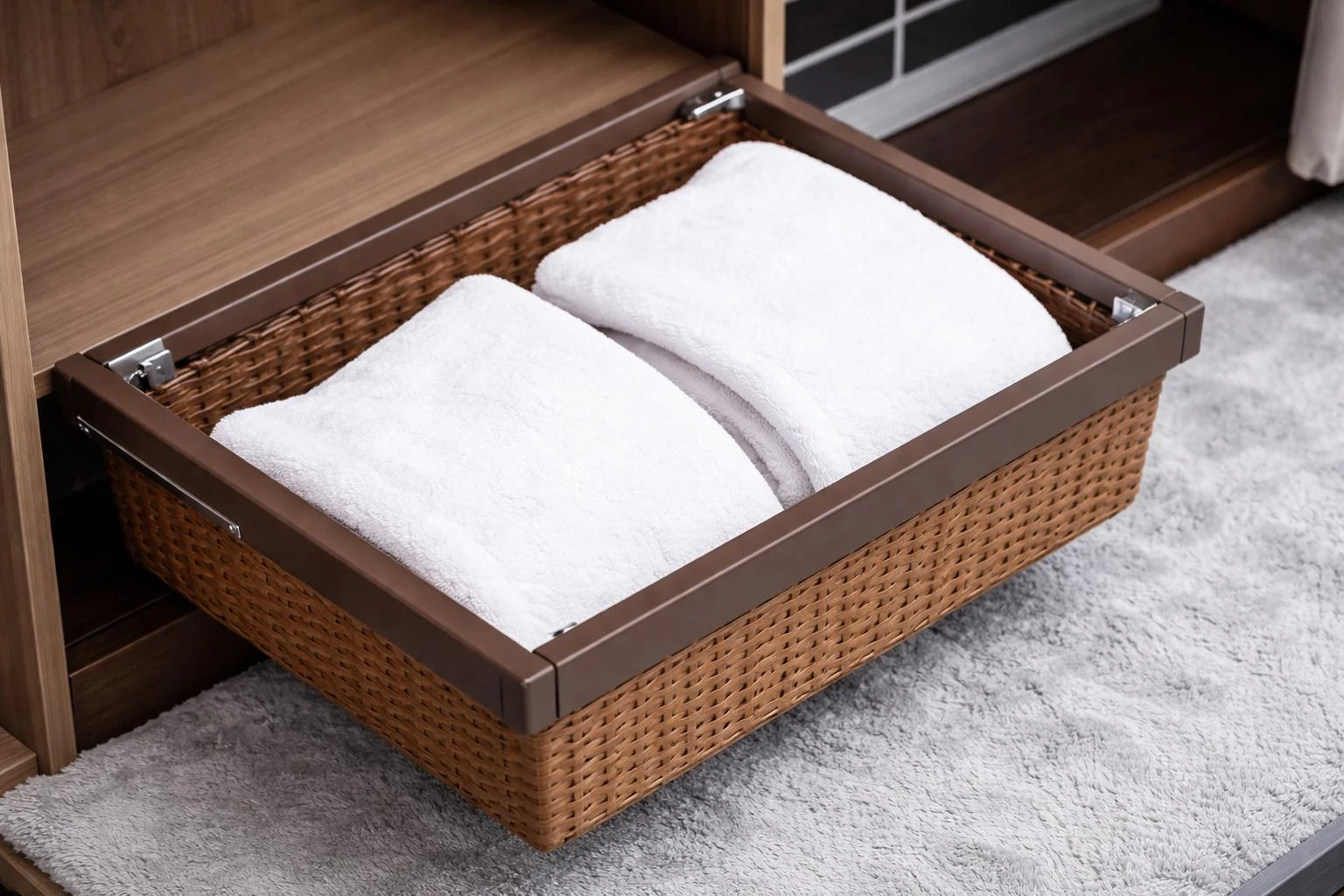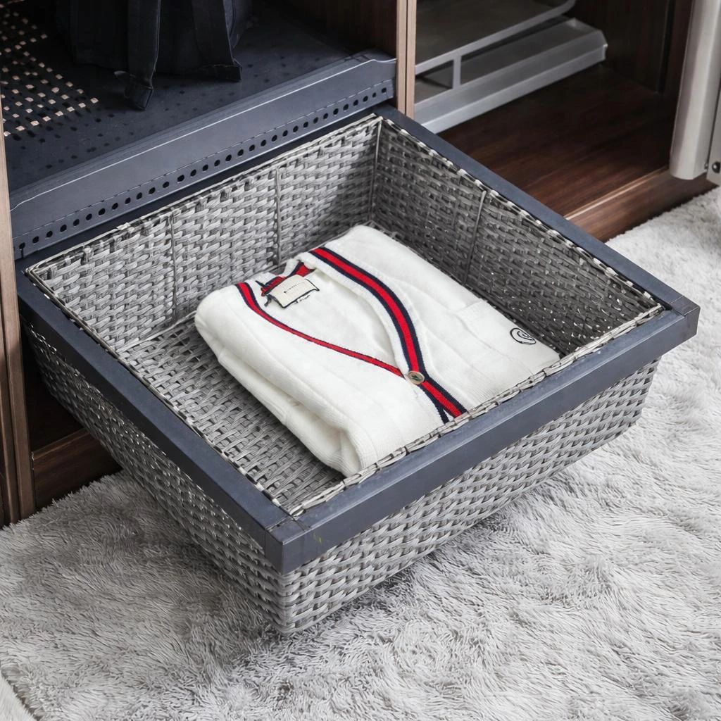The Rattan Basket is a premium cabinet storage solution designed to keep clothes and household items neatly organized. Built with a strong aluminum frame and a hand-woven rattan-style basket, it combines durability with an elegant modern look, making it ideal for wardrobes and modular cabinets.